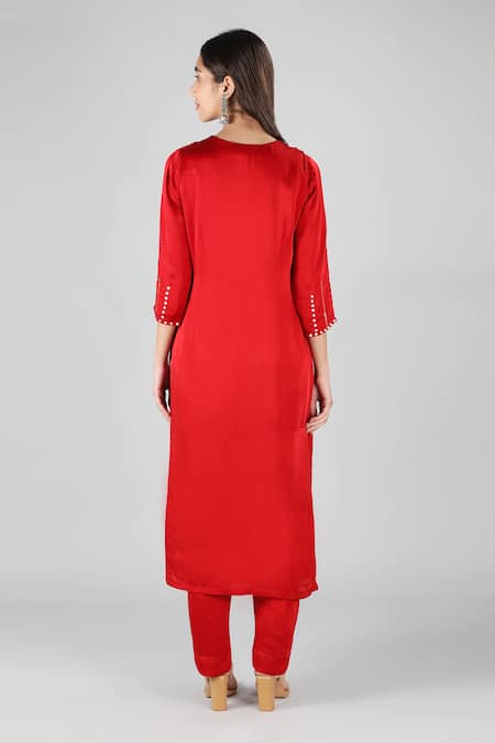 Red Silk Embroidery, Beads Split V-neck Crimson Hand Kurta Set