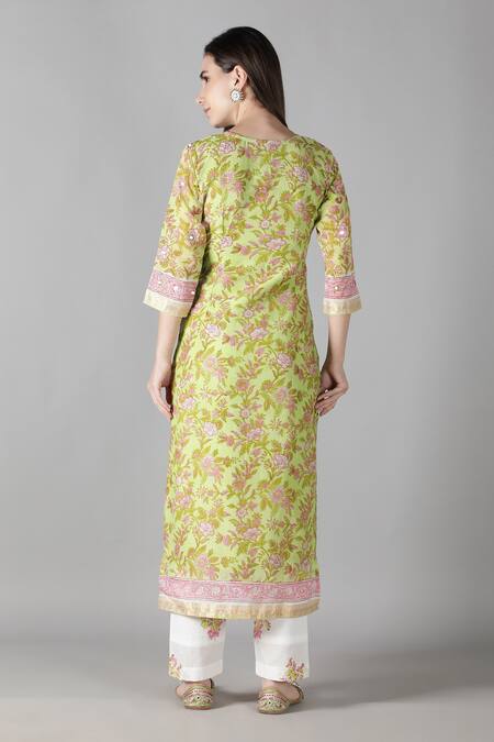Green Silk, Cotton Embroidery, Beads Split Floral Pattern Mirror Kurta Pant Set