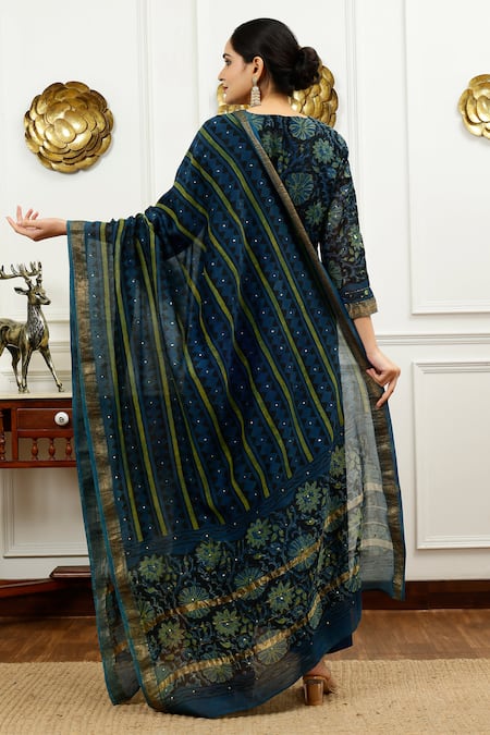 Blue kurta featuring all-over floral vine motifs with mirror, resham, and bead embroidery. Paired with matching pant and zari border dupatta.