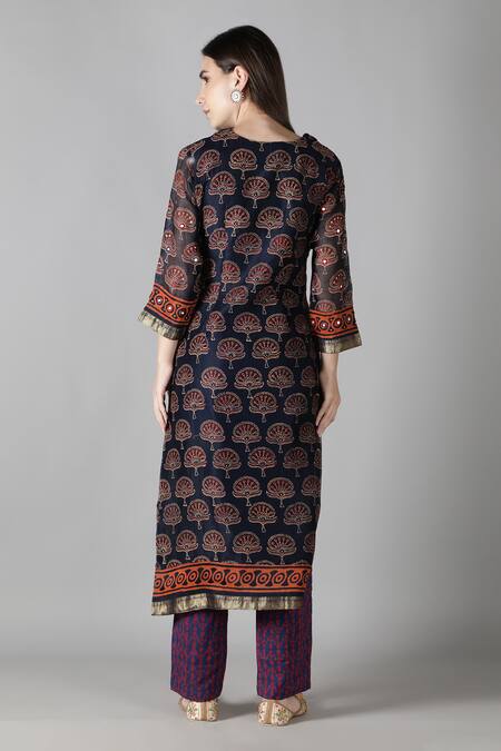 Buy_Sheeshakari_Blue Silk Embroidery, Beads, Mirrors Split V-neck And Resham Kurta Pant Set