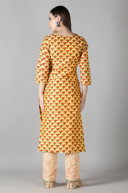 Yellow Silk, Cotton Embroidery, Mirrors Split V-neck Yoke Kurta Pant Set