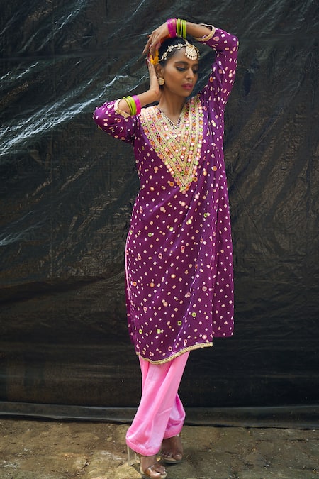 Purple bandhani kurta featuring a leaf neckline and ornate hand embroidery with gota, bead, and mirror work. Paired with a contrast rose pink solid salwar and a matching bandhani dupatta with embroidered zari pallu.