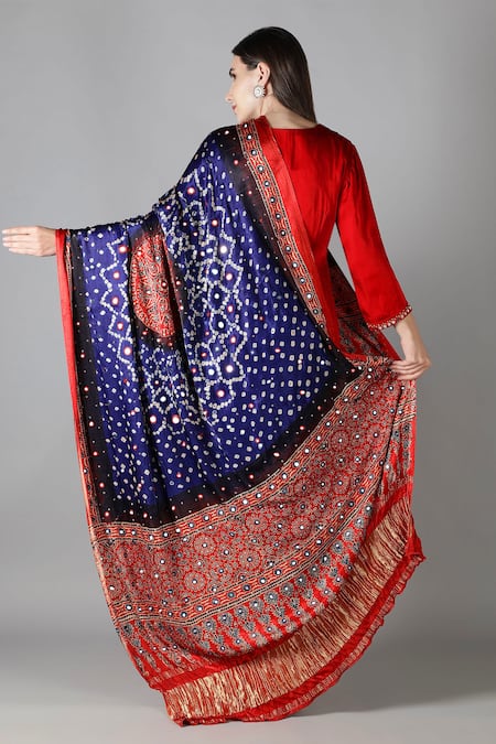 Intricate embroidery with mirror embellishments, Fringed edges on dupatta, Vibrant contrast color motifs