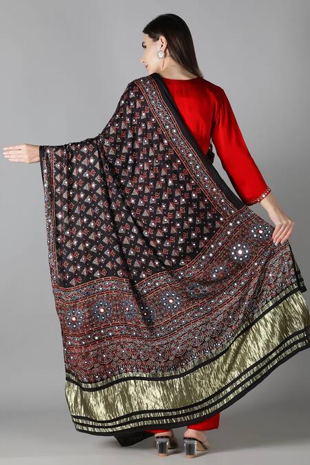 Intricate embroidery along the dupatta's border, Contrasting color palette with red and black, Detailed patterns on the dupatta