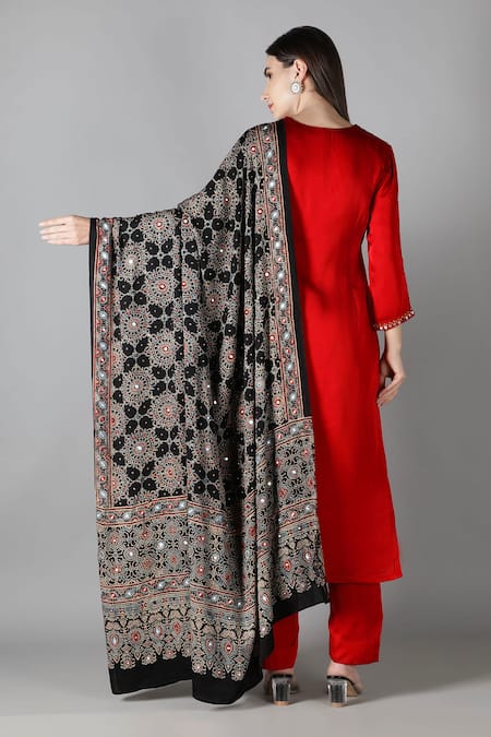 Red silk straight kurta featuring a round neckline and embellishments. Paired with matching red pant and a black dupatta adorned with intricate floral patterns.