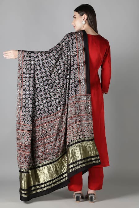 Red silk straight kurta featuring a round neckline and intricate embroidery. Paired with matching pants and a dupatta with detailed border designs.
