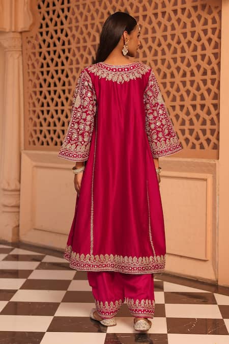 Hot pink chauga kurta featuring Kashmiri tilla and mirror work in floral motifs. Paired with a matching salwar and a dupatta adorned with floral jaal embroidery.