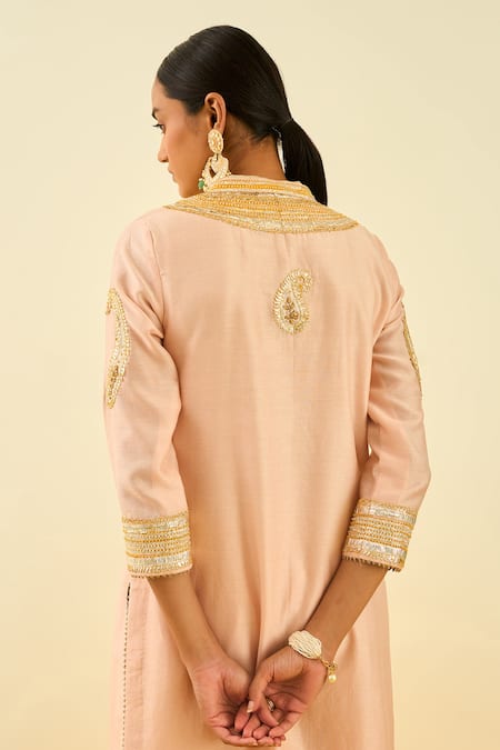 Rose pink kurta with gota patti work & highlighted with basra moti. Paired with embroidered hem palazzo.