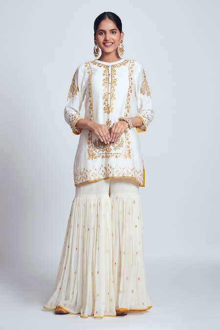 Daisy ivory straight short kurta with placement gota patti & dabka zardozi worked floral motifs. Comes with sharara pants.