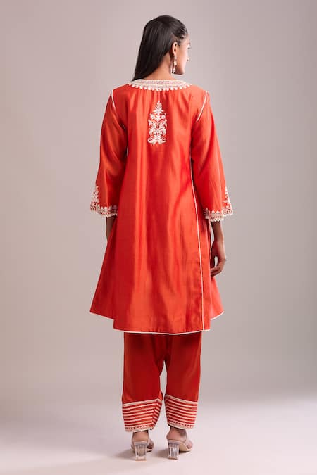 Burnt orange kurta featuring intricate embroidery and a relaxed fit. Paired with a matching salwar designed with embellished detailing at the hem.