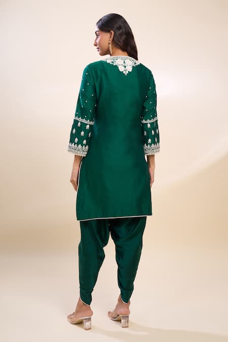 Emerald green kurta featuring intricate embroidery and a straight silhouette. Paired with a matching dhoti pant with stylish drape details.