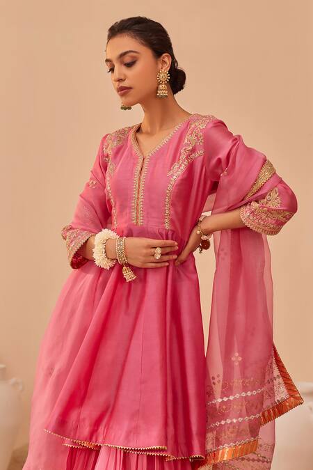 Flamingo pink peplum anarkali featuring tilla, patra, and zari thread embroidery. Paired with a tiered gharara and a sheer printed dupatta with gota lace embroidered hem.