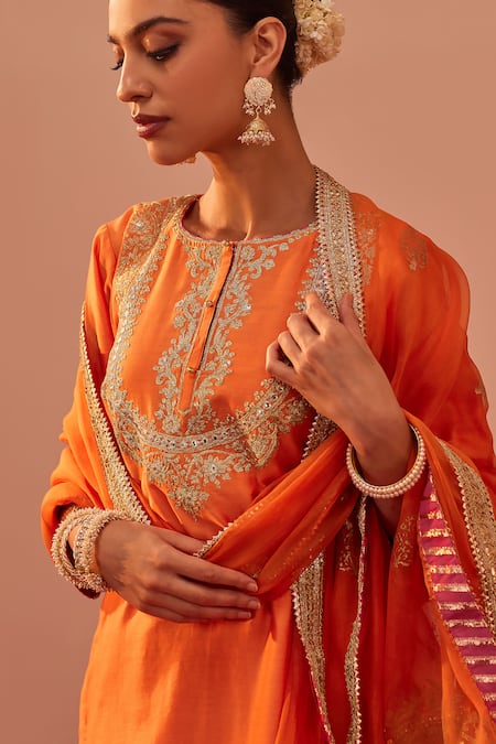 Tangerine orange kurta featuring intricate tilla, patra, zari thread, and foil mirror embroidery. Paired with a floral hand block printed salwar and a sheer embroidered dupatta with a cutwork border.