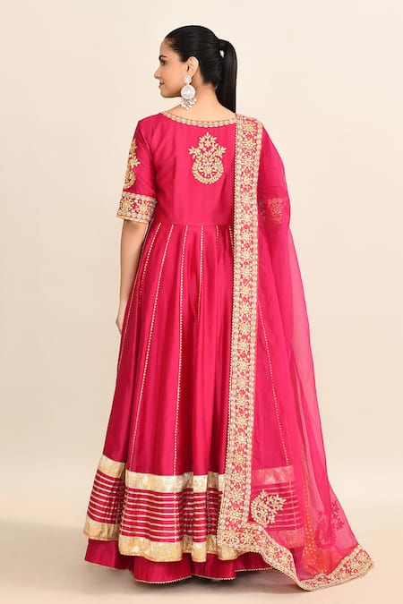 Hot pink anarkali featuring gota patti embroidery on the bodice and hem. Paired with a matching skirt and dupatta adorned with floral embroidered borders.