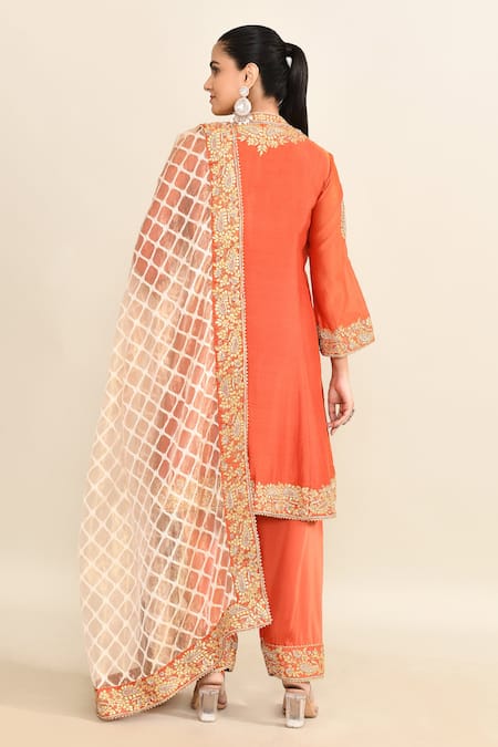Orange kurta featuring floral and gota patti embroidery on the yoke, cuffs, and hem. The set includes a pant with embroidered hem and a dupatta with an embroidered border.
