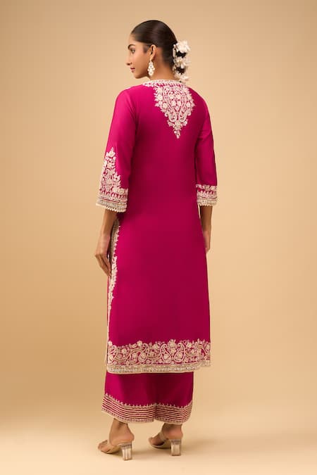 Hot pink choga featuring intricate embroidery and a round neckline. Paired with matching pant and dupatta adorned with lace detailing.