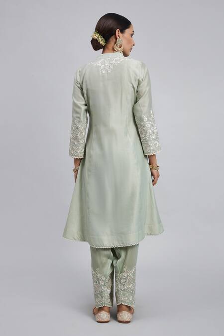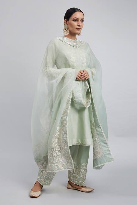 Mint green kurta with princess-cut, placement floral motif parsi gara embroidery & pearl lace border. Comes with dogri salwar & silk organza dupatta.