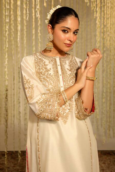 Ivory kurta featuring round neckline, three-quarter sleeves, and front button detailing. Paired with embroidered palazzo and kiran lace bordered dupatta.