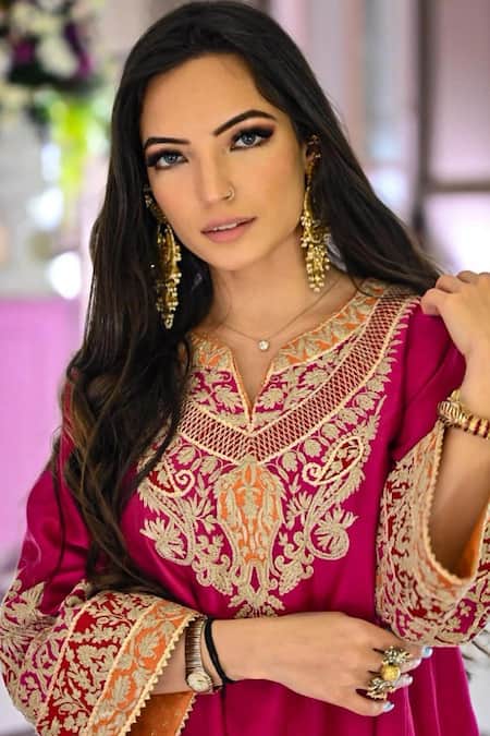 Hot pink choga featuring Kashmiri tilla and gota applique embroidered yoke in floral pattern. Paired with a matching salwar.