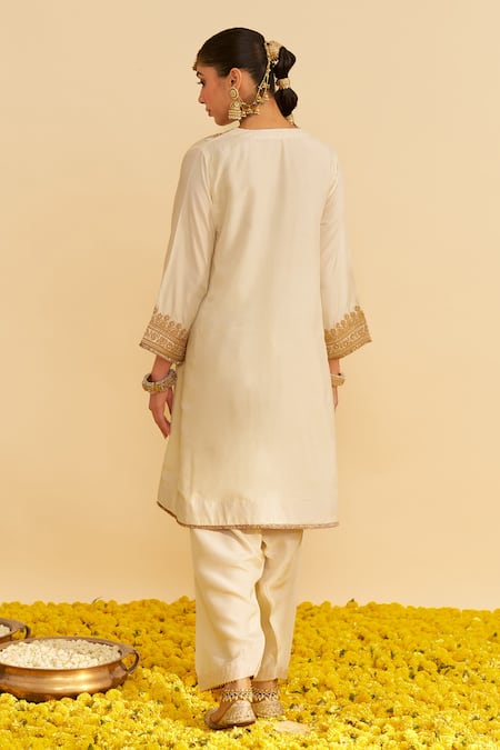 Daisy ivory chauga kurta featuring intricate embroidery on the neckline. Paired with a salwar and a dupatta in coordinating colors.
