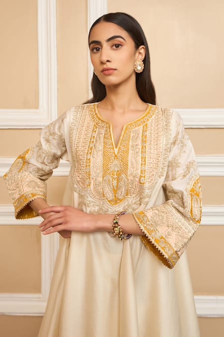 Ivory choga featuring Kashmiri tilla and gota applique embroidered yoke in floral pattern. Paired with matching salwar in Bamberg satin fabric.
