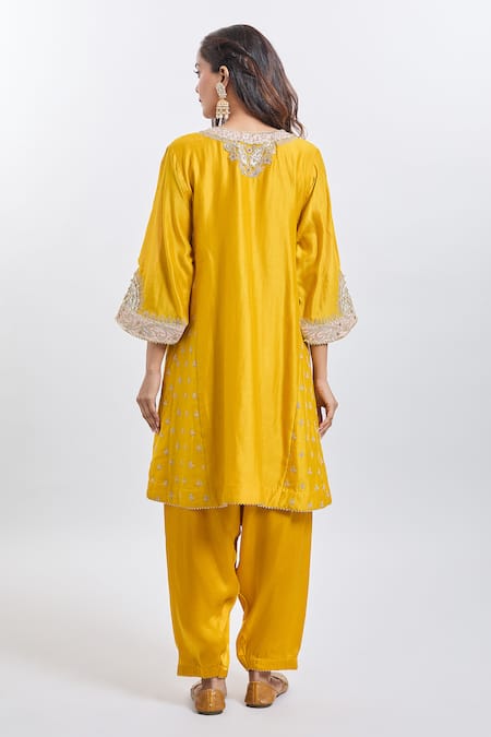 Mustard yellow kurta featuring intricate embroidery along the neckline and sleeves. Paired with a matching salwar that has a relaxed fit.
