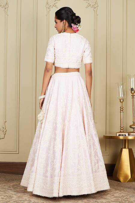 Pearl blush lehenga in pure raw silk base with floral motif dori embroidery. Paired with embroidered blouse & sheer scalloped hem dupatta.