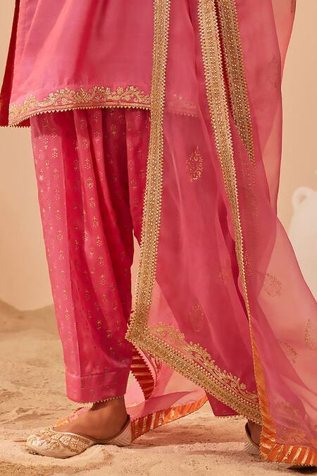 Flamingo pink kurta featuring round neckline, three quarter sleeves, and intricate tilla, patra, zari thread & foil mirror embroidery. Paired with floral hand block printed salwar and a sheer embroidered silk organza dupatta with a cutwork border.