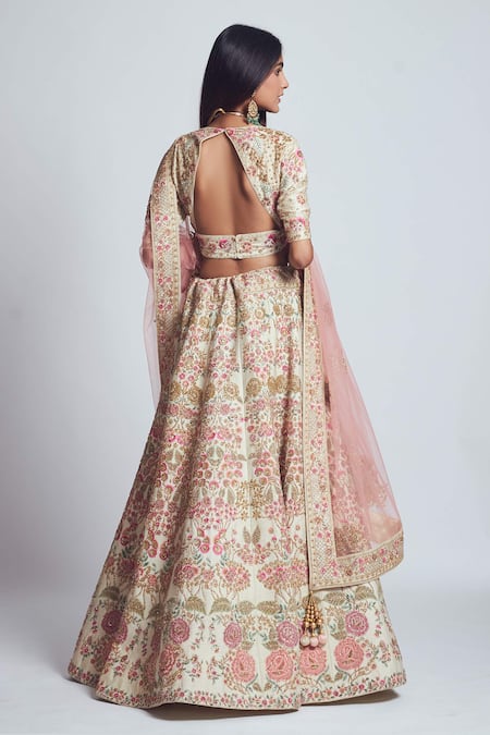 Blush pink & daisy ivory panelled lehenga with all-over floral motif parsi & dabka zardozi hand embroidery. Comes with blouse enhanced with placement dabka-zarodi work & dupatta.