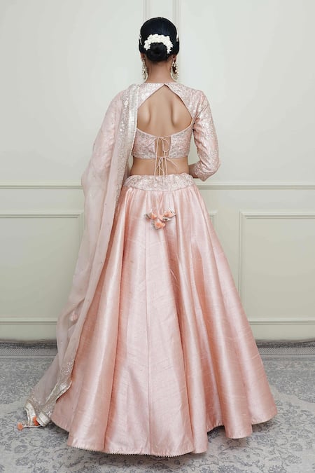 Pearl pink pure raw silk lehenga with Kashmiri tilla embroidered round-neck blouse. Paired with silk organza dupatta.