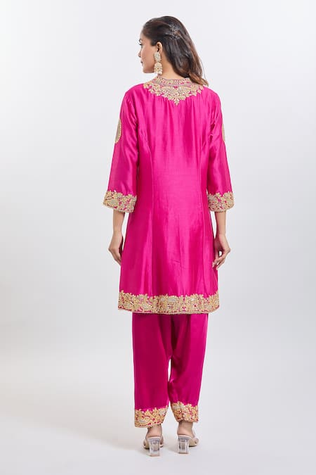 Hot pink kurta featuring intricate gold embroidery and a front placket. Paired with a matching salwar and a contrasting dupatta with a grid pattern.