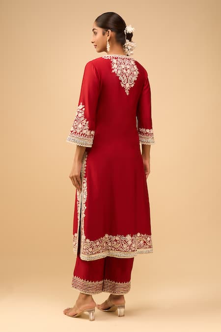 Red kurta featuring intricate embroidery and a round neckline. Paired with matching red pant and dupatta adorned with similar embroidery details.