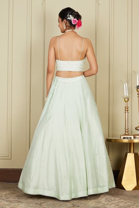 Frosty green kalidar lehenga in pure habutai silk base. Paired with bustier with floral motif dori embroidery & embellished dupatta.