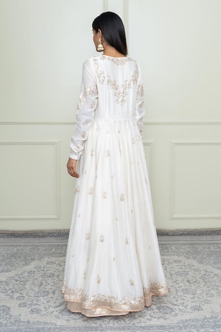 Daisy ivory silk chanderi anarkali with Kashmiri tilla embroidery highlighted with ivory pearls & gathered sleeves. Paired with cotton crushed skirt & silk organza embroidered tassel pearl pink dupatta.