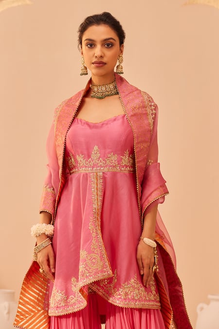 Flamingo pink kurta featuring a sweetheart neckline and noodle straps. Paired with a tiered gharara and a sheer embroidered dupatta.