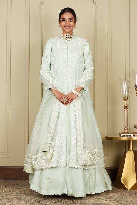 Frosty green long jacket kurta with floral motif dori embroidery. Paired with kalidar lehenga in pure habutai silk base, embroidered bustier & embellished dupatta.