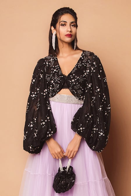 Black lace cropped blouse with silver-tone rhinestone crystal hand embroidery & bishop sleeves. Comes with lilac lehenga.