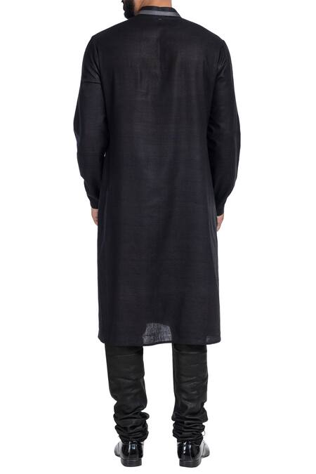 This mandarin collared kurta and pants in black is made from matka silk. The embroidered stole in grey renders sartorial splendor.