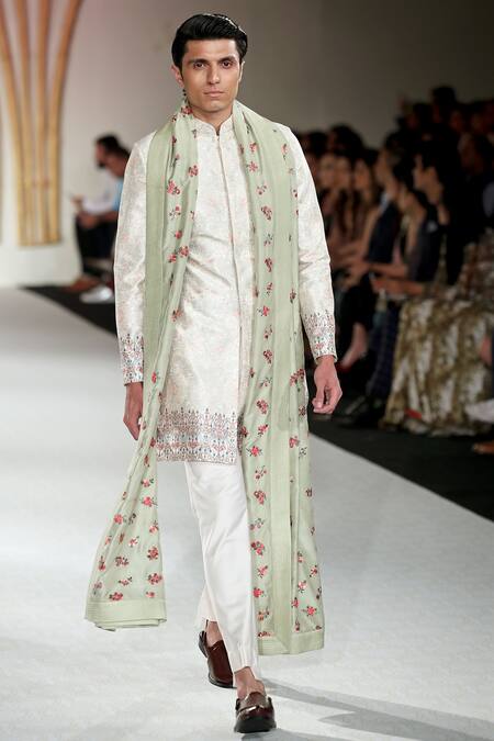 Ivory sherwani with all-over floral motif work paired with printed green dupatta. This set comes with straight pants.