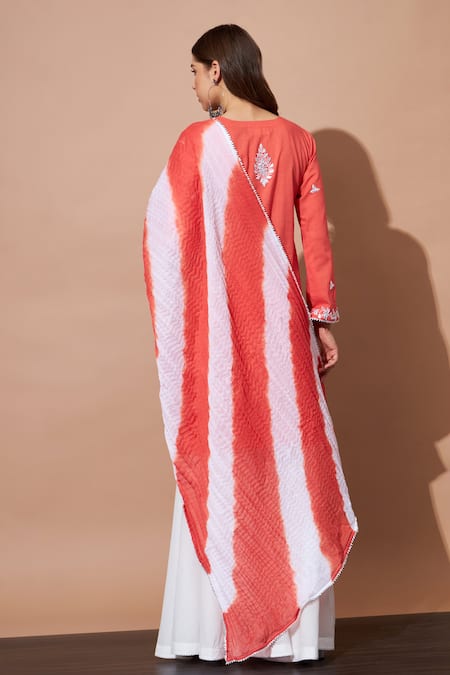 Orange kurta featuring a round neckline, full sleeves, and hand embroidery with pearl, aari, and gota work. Paired with a contrast flared sharara and a crinkled dupatta with leheriya pattern.