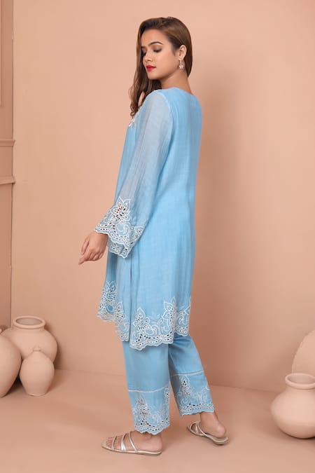 Blue Chanderi Lace, Embroidery, Cut Work Collared Floral Kurta Salwar Set