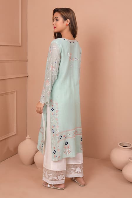 Green Chanderi Embroidery, Mirrors Split V-neck Floral Jaali Kurta Pant Set