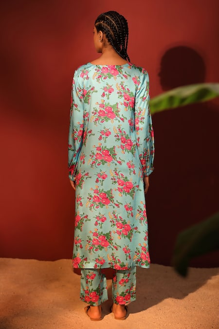 Buy_Shetab Kazmi_Blue Modal, Satin Round Neck Floral Print Kurta Pant Set _at_Aza_Fashions
