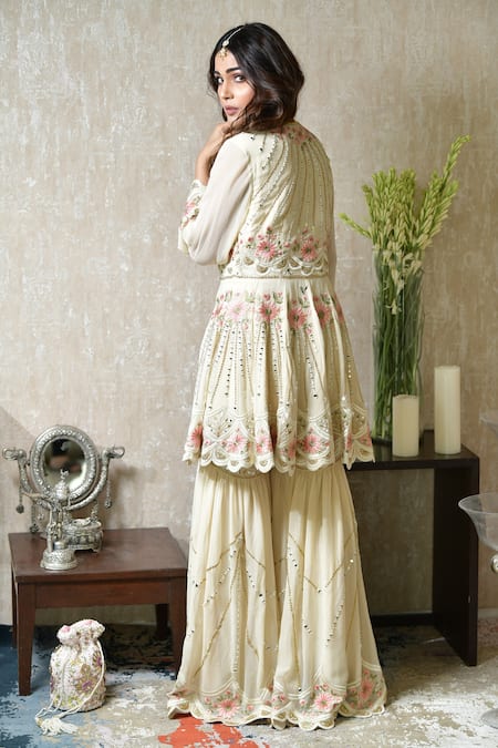 Pastel yellow peplum kurta with thread & mirror embroidery. Comes with embroidered sharara & dupatta.