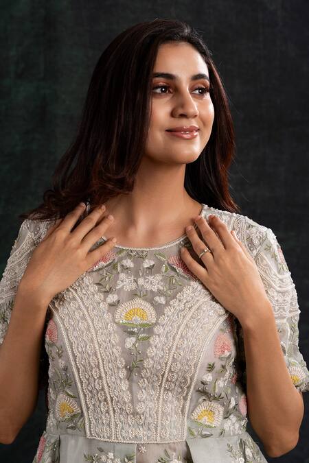 3D floral embroidery, Beaded embellishments, Layered ruffles design