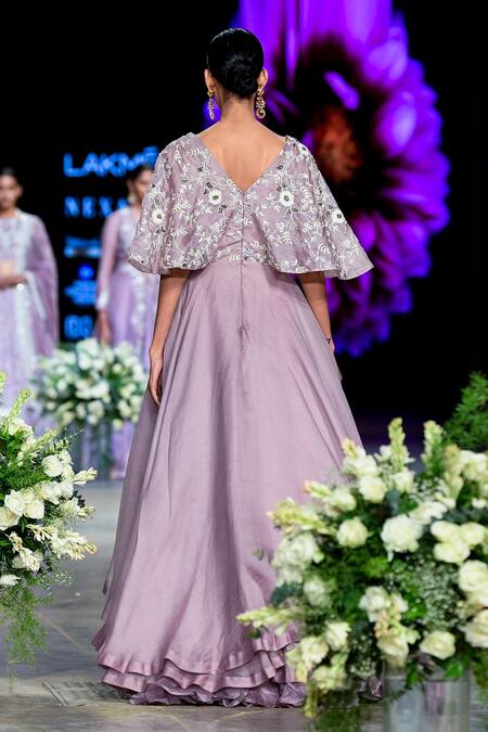 Lavender layered gown with 3D floral embroidered motifs & flared sleeves.