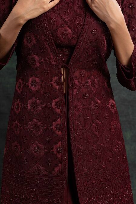 Maroon embroidered jacket featuring 3D cutdana work and front tie-up closure. Paired with a matching inner and sharara.