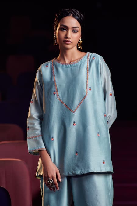 Blue silk chanderi loose-fit top with thread embroidered floral motifs. Paired with silk chanderi embroidered hem straight pant.