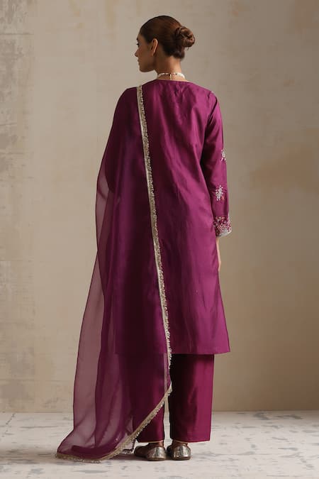 Aubergine purple A-line kurta featuring bloom embroidery and three fourth sleeves. Paired with a matching pant and a lace border embellished dupatta.