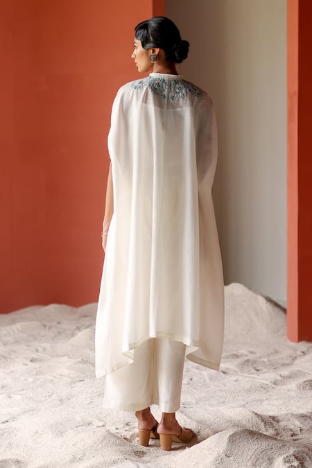 Ivory thread and mirror embroidered cape featuring a high round neckline and asymmetric sleeves. Paired with wide leg silk chanderi pants and a cotton slip.